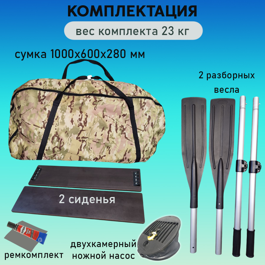 - Весь комплект надувной лодки в собранном виде умещается в 1 сумку.