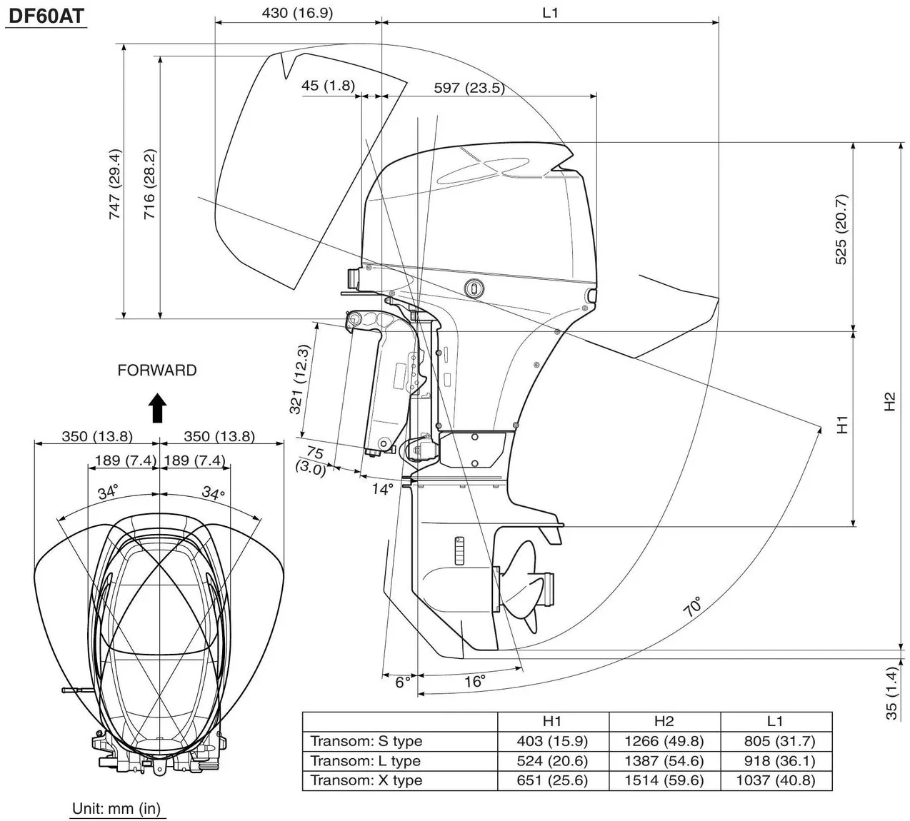 Вес мотора: 102 кг. (DF60ATS) / 104 кг. (DF60ATL) / 107 кг. (DF60ATX).